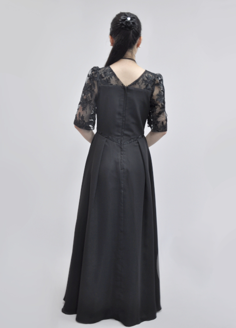 ハイウエストのすっきりした切替が袖付のやぼったい感じを忘れさせてくれます。スカートの分量もたっぷりあり、年齢問わず品よく着ていただけるレース黒ドレスです。