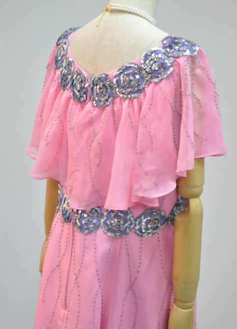 襟周りとウエスト周りのアップリケのようなフラワーモチーフはスパンコールが輝く舞台向けの装飾。