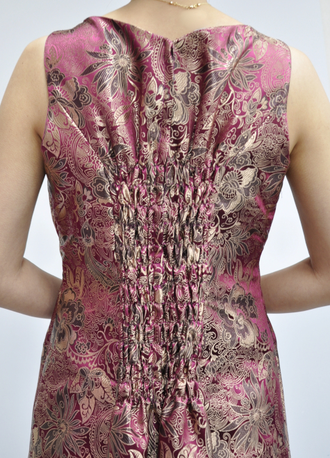 こちらのジャガード生地は濃いピンクにシャンパンゴールドが合わさったお色味です。照明によって色が変化するのも素敵なポイント♪