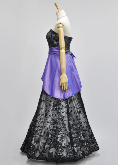 裏地のホワイトサテン生地×ブラックのスパンコールチュールドレスに、パープルがアクセントとなった1着です。