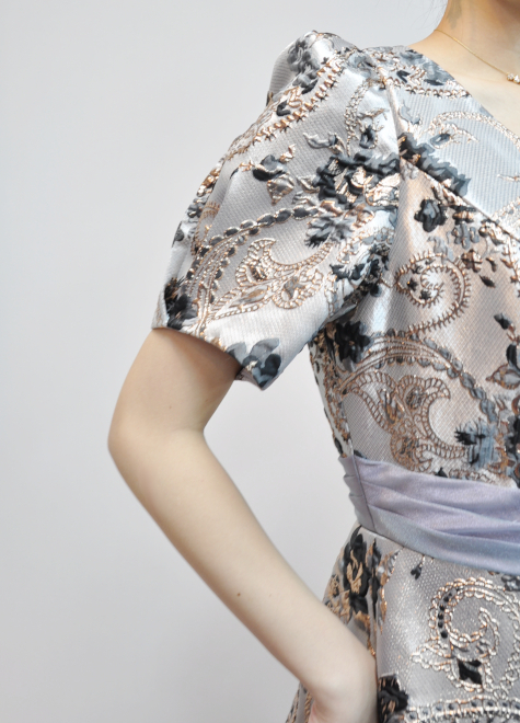 立体的ある模様が特徴的なジャガード織には、ブラックカラーの模様も入っており、ドレス全体が野暮ったくならない締め色として活躍。