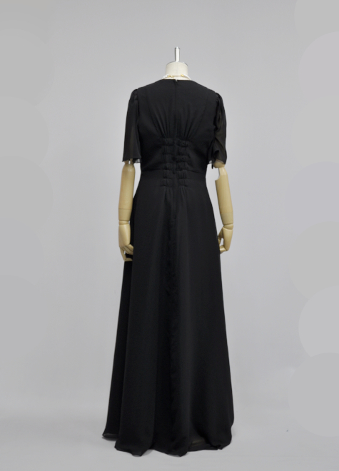 パッと見は1726と似たようなデザインですが、ウエストの切り替えをアンダーバストにすることにより脚長効果とAラインの綺麗さがより目立ちます。襟元がすっきりしているのでどんなアクセサリーとも相性が良く、使い場所を選びません。