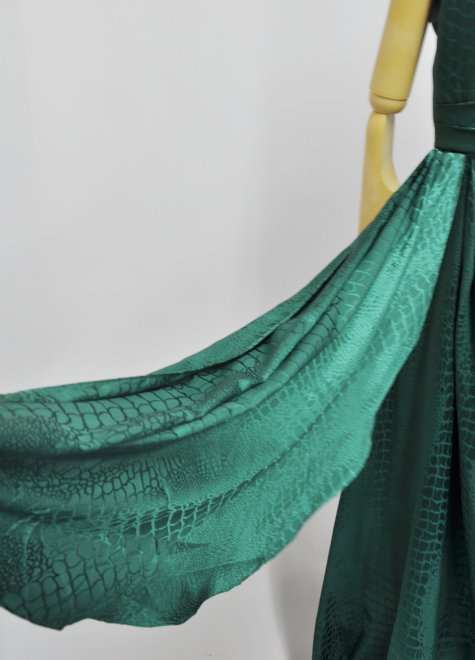 胸元のカシュクール風加工、ウエストライン強調、スカート右サイドにドレープデザインを施すことで