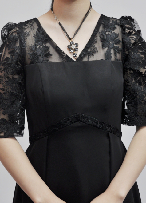 ハイウエストのすっきりした切替が袖付のやぼったい感じを忘れさせてくれます。スカートの分量もたっぷりあり、年齢問わず品よく着ていただけるレース黒ドレスです。